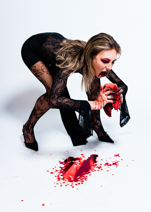 The model, dressed in torn black lace, contrasts sharply against an infinite white background. Blood drips from her mouth as she bites into a cow heart, symbolizing primal hunger and desire. The tension between beauty and brutality, with delicate lace and violent consumption, highlights the duality of human nature—feminine power and savagery in harmony. The minimalist setting draws focus to her raw, unapologetic dominance, evoking themes of desire, chaos, and the thin line between elegance and destruction.